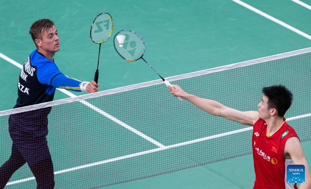 Hans-Kristian Solberg Vittinghus (L) of Denmark and Li Shifeng of China compete during the first round of men's singles match at the 2023 Canada Open badminton tournament in Calgary, Canada, on July 5, 2023. (Photo by Zou Zheng/Xinhua)