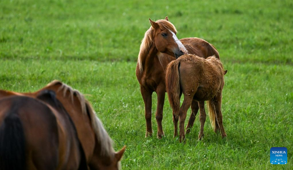 This photo taken on July 5, 2023 shows horses on the grassland in Holin Gol, north China's Inner Mongolia Autonomous Region. The picturesque grassland in Holin Gol, located at the intersection of Horqin Grassland, Xilin Gol Grassland and Hulunbuir Grassland, is one of the primitive grasslands in Inner Mongolia Autonomous Region. (Xinhua/Lian Zhen)