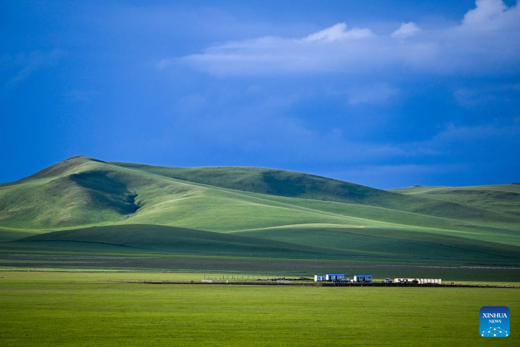 This photo taken on July 5, 2023 shows the scenery of the grassland in Holin Gol, north China's Inner Mongolia Autonomous Region. The picturesque grassland in Holin Gol, located at the intersection of Horqin Grassland, Xilin Gol Grassland and Hulunbuir Grassland, is one of the primitive grasslands in Inner Mongolia Autonomous Region. (Xinhua/Lian Zhen)