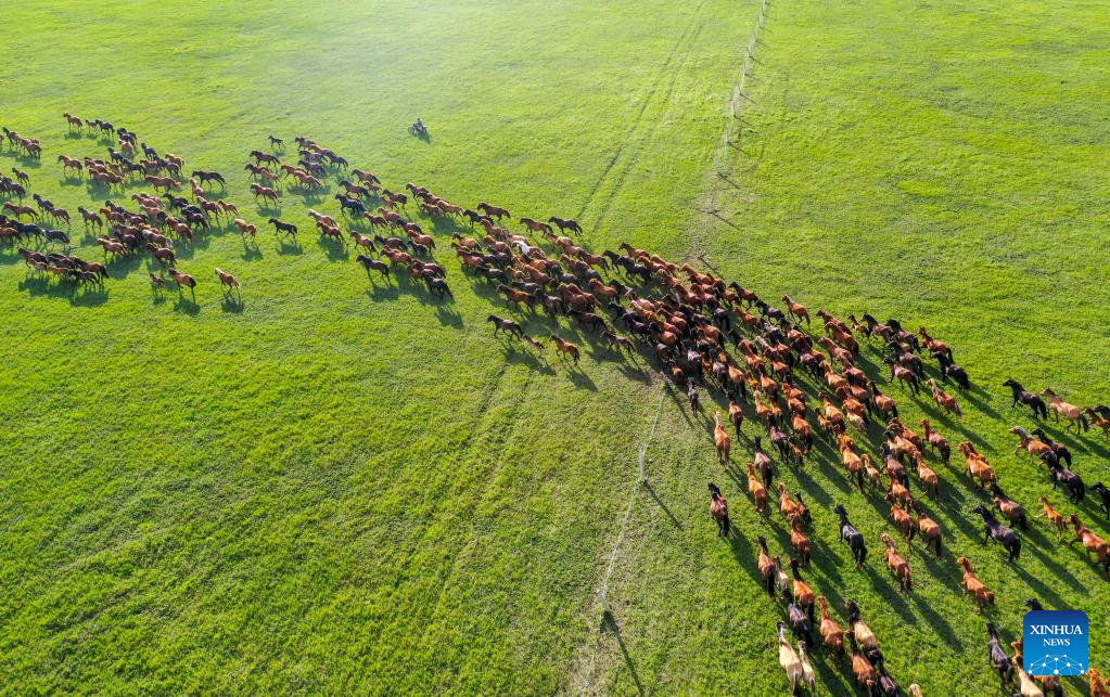 This aerial photo taken on July 5, 2023 shows horses running on the grassland in Holin Gol, north China's Inner Mongolia Autonomous Region. The picturesque grassland in Holin Gol, located at the intersection of Horqin Grassland, Xilin Gol Grassland and Hulunbuir Grassland, is one of the primitive grasslands in Inner Mongolia Autonomous Region. (Xinhua/Lian Zhen)