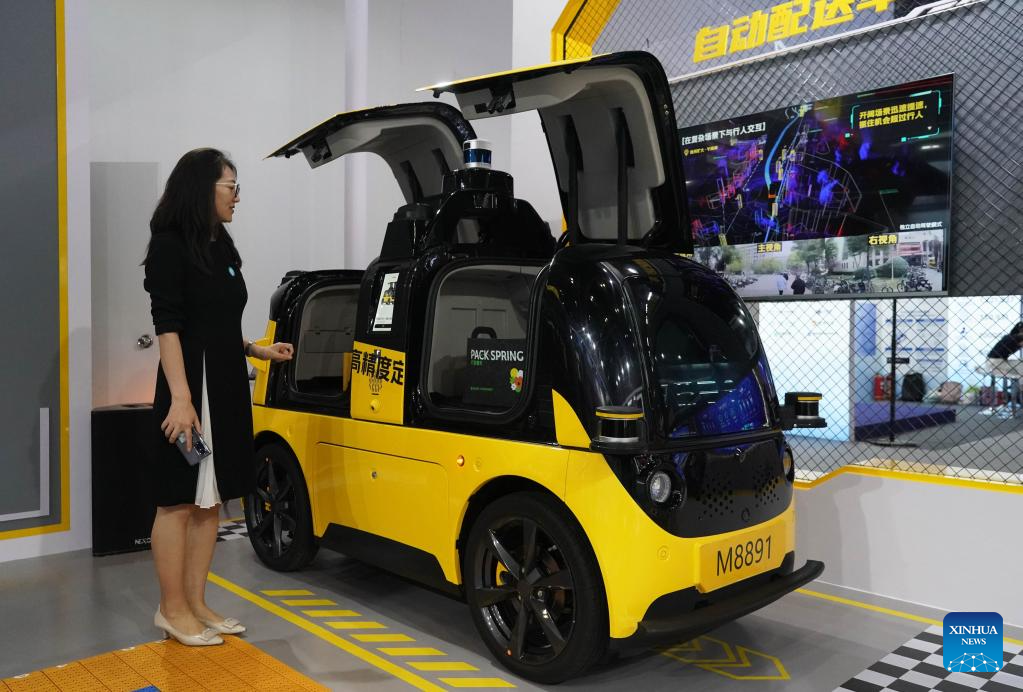 This photo taken on July 4, 2023 shows an automatic delivery vehicle at an exhibition during the Global Digital Economy Conference 2023 at the China National Convention Center in Beijing, capital of China. The Global Digital Economy Conference 2023 is scheduled from July 4 to 7 in Beijing. (Xinhua/Ren Chao)
