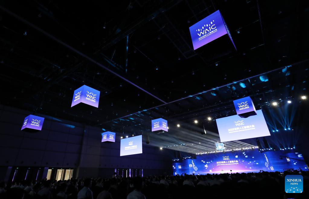 This photo taken on July 6, 2023 shows the opening ceremony of the World Artificial Intelligence Conference (WAIC) 2023 in Shanghai, east China. Themed "Intelligent Connectivity Generating Future," the three-day WAIC 2023 kicked off in Shanghai on Thursday. The conference's major exhibitions focus on sectors such as core technology, intelligent terminals, application empowerment and cutting-edge technology, with over 400 exhibitors in attendance. (Xinhua/Fang Zhe)