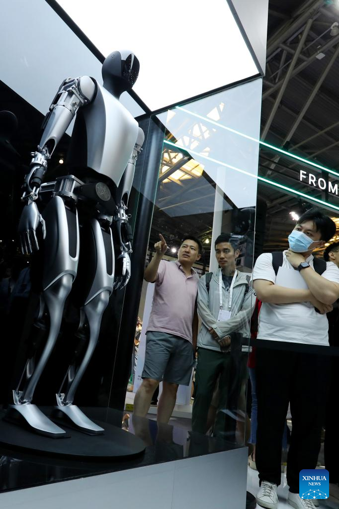 Visitors watch a robot from Tesla during the World Artificial Intelligence Conference (WAIC) 2023 in Shanghai, east China, July 6, 2023. Themed "Intelligent Connectivity Generating Future," the three-day WAIC 2023 kicked off in Shanghai on Thursday. The conference's major exhibitions focus on sectors such as core technology, intelligent terminals, application empowerment and cutting-edge technology, with over 400 exhibitors in attendance. (Xinhua/Fang Zhe)