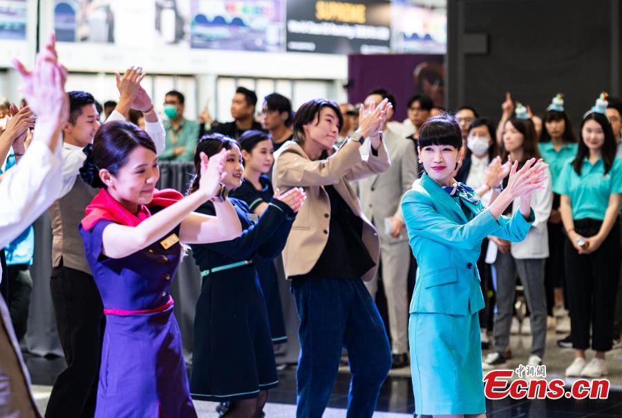 Artists and airport staff perform a flash mob dance to celebrate the 25th anniversary of the Hong Kong International Airport (HKIA) in the Hong Kong Special Administrative Region, July 6, 2023. HKIA officially opened to traffic on July 6, 1998. (Photo: China News Service/Hou Yu)