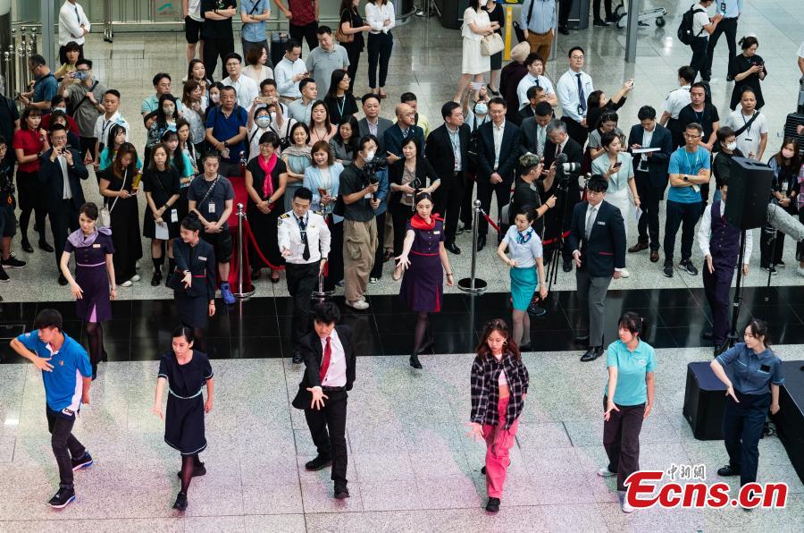 Artists and airport staff perform a flash mob dance to celebrate the 25th anniversary of the Hong Kong International Airport (HKIA) in the Hong Kong Special Administrative Region, July 6, 2023. (Photo: China News Service/Hou Yu)