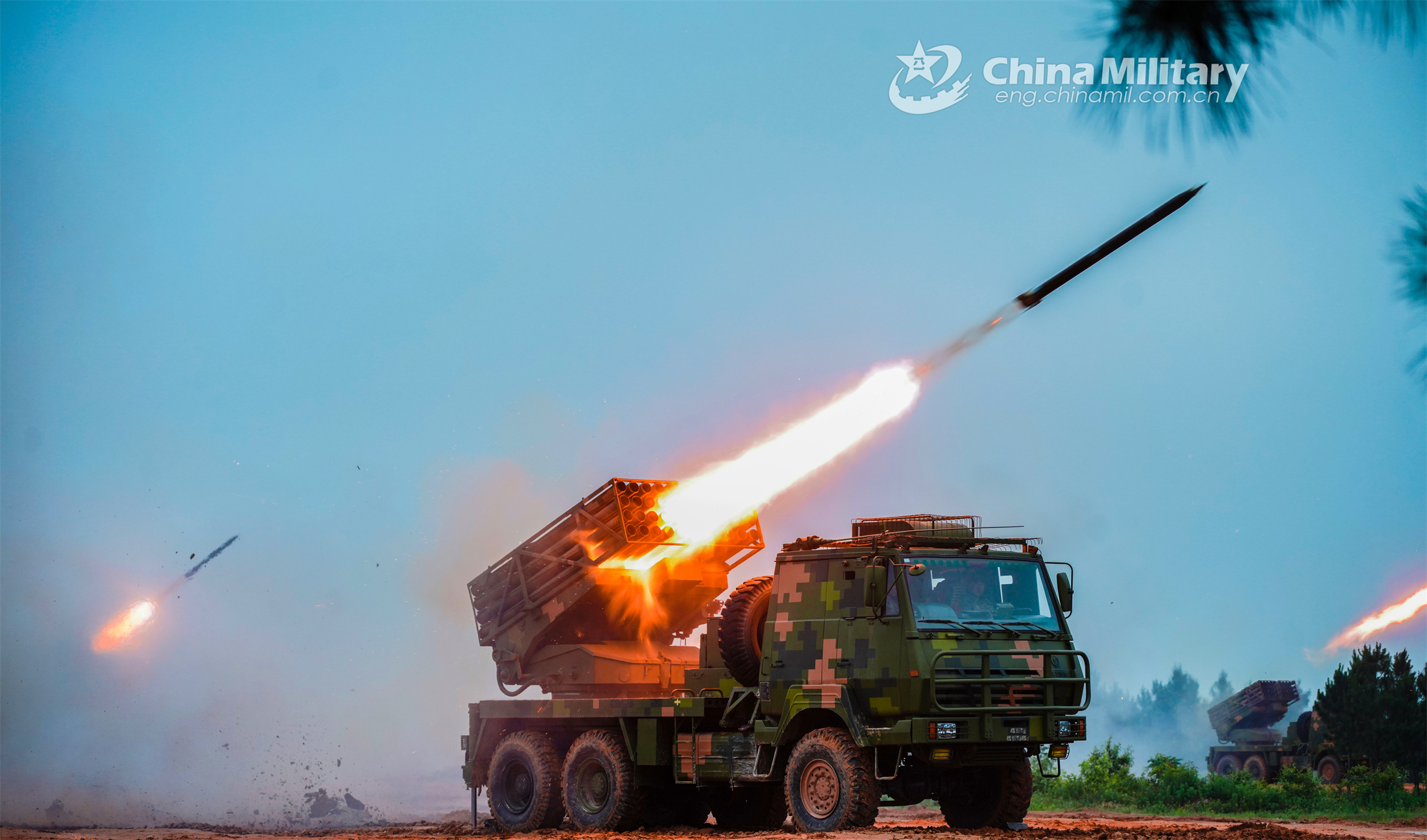 Long-range multiple rocket launcher systems (MRLS) attached to a brigade under the PLA 71st Group Army fire at mock targets during a recent live-fire exercise in unfamiliar terrain. (eng.chinamil.com.cn/Photo by Huang Rui)