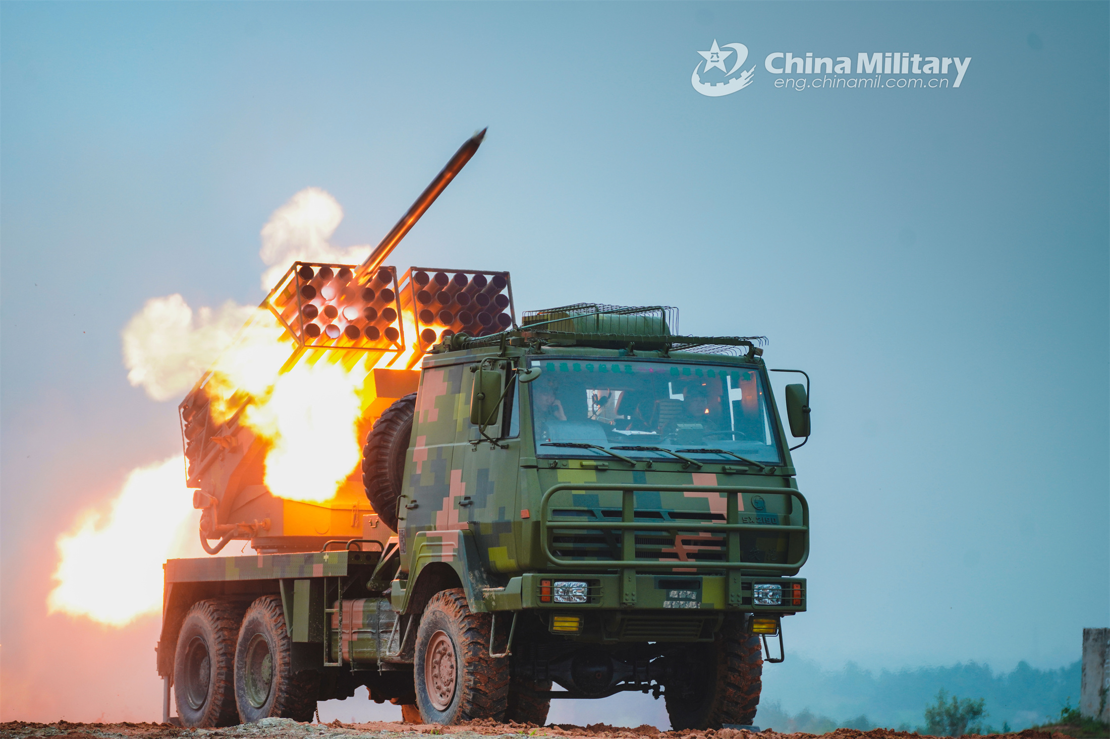 Long-range multiple rocket launcher systems (MRLS) attached to a brigade under the PLA 71st Group Army fire at mock targets during a recent live-fire exercise in unfamiliar terrain. (eng.chinamil.com.cn/Photo by Huang Rui)