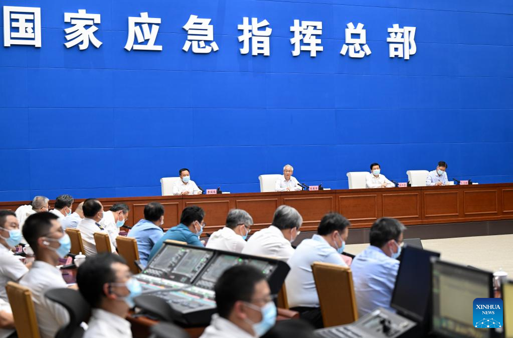 Chinese Vice Premier Zhang Guoqing, also a member of the Political Bureau of the Communist Party of China Central Committee, arranges flood prevention and disaster relief work at the national command headquarters for emergencies on July 6, 2023. (Xinhua/Zhang Ling)