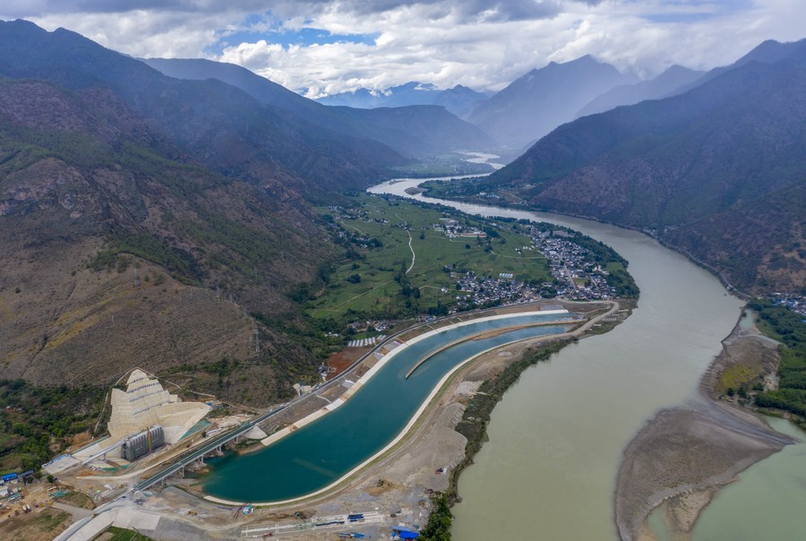 This aerial photo taken on June 20, 2023 shows the construction site of the water sourcing section of the Central Yunnan Water Diversion Project in Shigu Town of Lijiang City, southwest China's Yunnan Province. (Xinhua/Chen Xinbo)