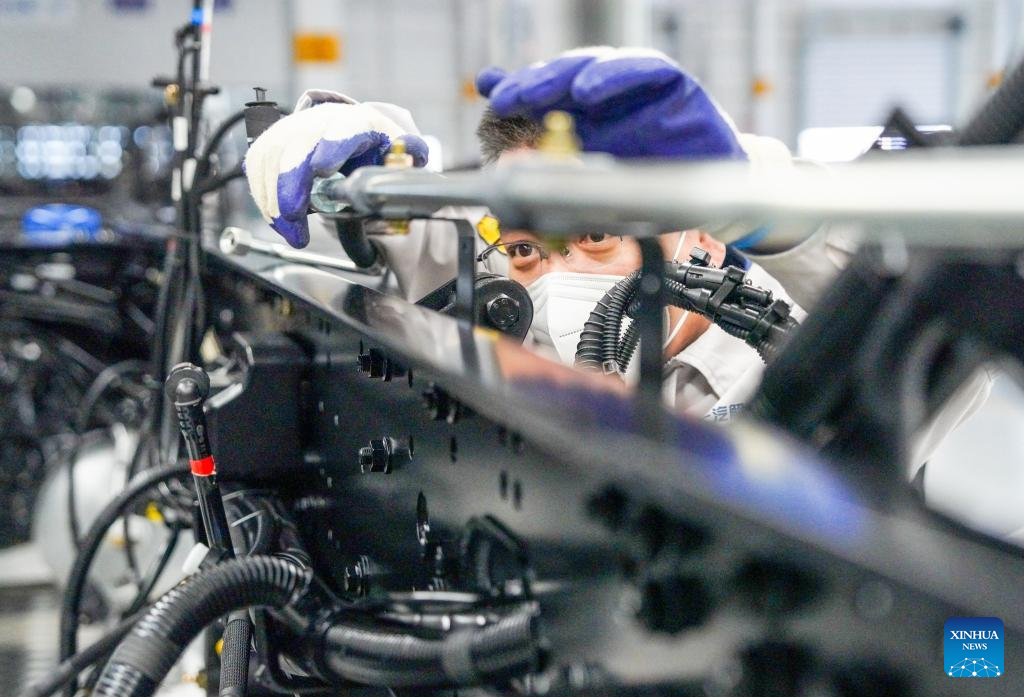 This photo taken on June 12, 2023 shows a worker assembling vehicles at the general assembly line of FAW-Volkswagen in Changchun, northeast China's Jilin Province. (Xinhua/Yan Linyun)