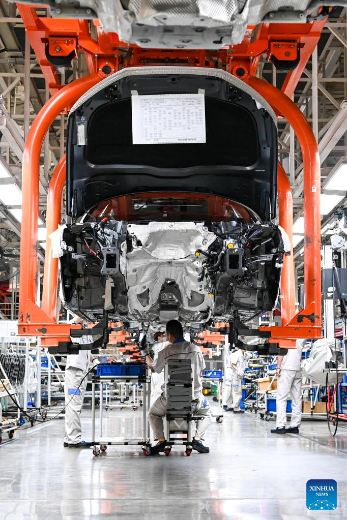 This photo taken on June 12, 2023 shows workers assembling vehicles at the general assembly line of FAW-Volkswagen in Changchun, northeast China's Jilin Province. (Xinhua/Yan Linyun)