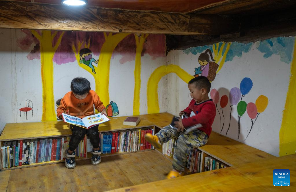 Children read books at the "Banshan Huayu" library in Qiunatong Village of Bingzhongluo Township in Gongshan Dulong and Nu Autonomous County, Lisu Autonomous Prefecture of Nujiang, southwest China's Yunnan Province, July 5, 2023. (Xinhua/Fei Maohua)