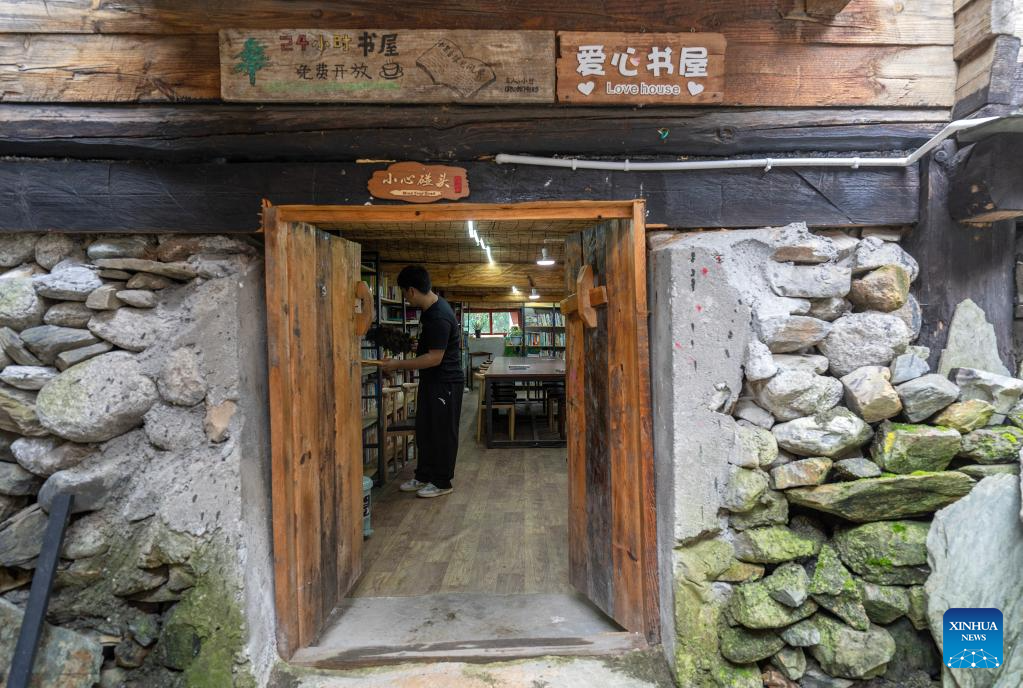 Gan Wenyong is pictured at the "Banshan Huayu" library in Qiunatong Village of Bingzhongluo Township in Gongshan Dulong and Nu Autonomous County, Lisu Autonomous Prefecture of Nujiang, southwest China's Yunnan Province, July 6, 2023. (Xinhua/Fei Maohua)