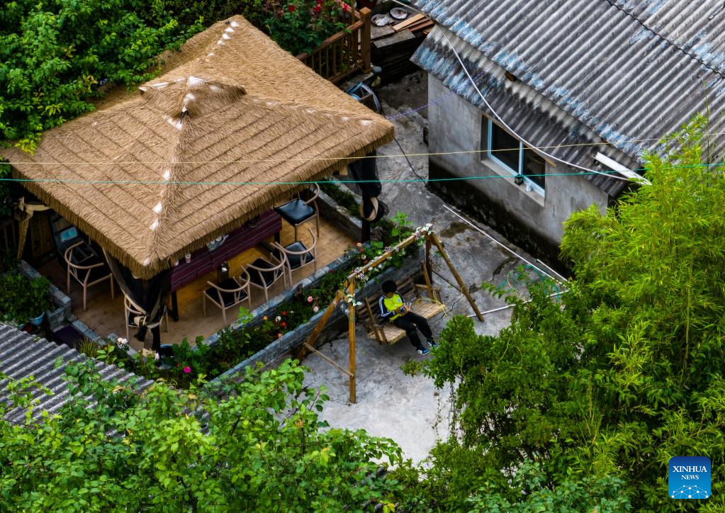 This aerial photo taken on July 5, 2023 shows a child reading at the "Banshan Huayu" library in Qiunatong Village of Bingzhongluo Township in Gongshan Dulong and Nu Autonomous County, Lisu Autonomous Prefecture of Nujiang, southwest China's Yunnan Province. (Xinhua/Jiang Wenyao)