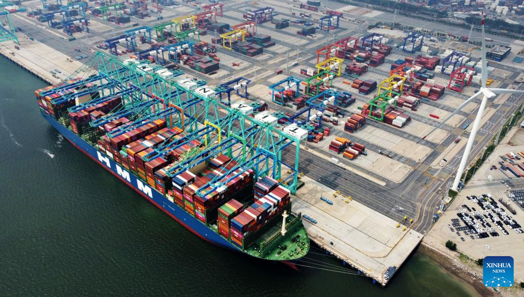 This aerial photo shows a cargo ship at a smart container terminal of Tianjin Port in north China's Tianjin, July 7, 2023. (Xinhua/Zhao Zishuo)
