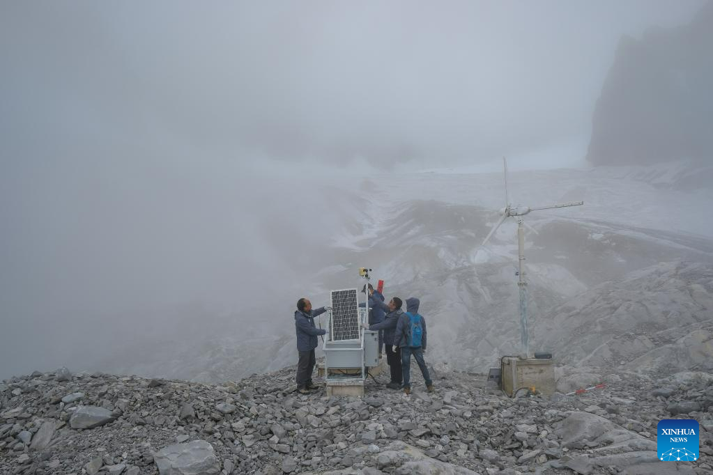 Wang Shijin (1st L) works with his teammates on the Baishui River No. 1 Glacier on the Yulong Snow Mountain in Lijiang City, southwest China's Yunnan Province, June 19, 2023. (Xinhua/Zhang Cheng)
