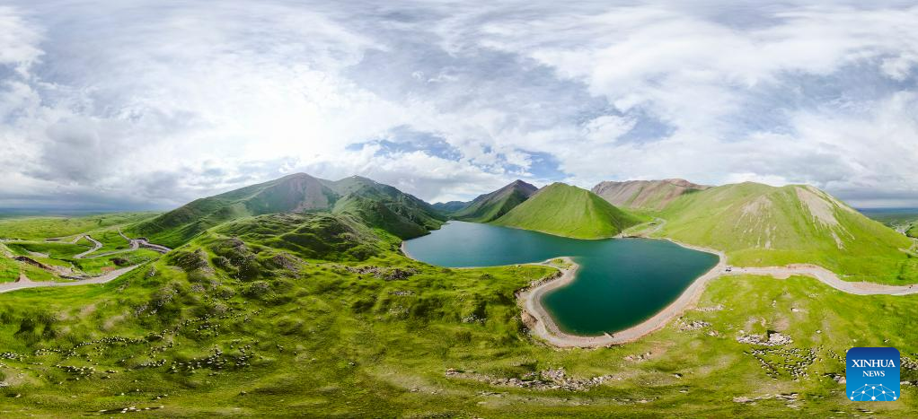 This aerial panorama photo taken on July 5, 2023 shows a mountain lake in Hejing County, Bayingolin Mongolian Autonomous Prefecture, northwest China's Xinjiang Uygur Autonomous Region. Midsummer is one of the best time of year to visit the Bayan Bulag grassland in Hejing County. (Xinhua/Hao Zhao)