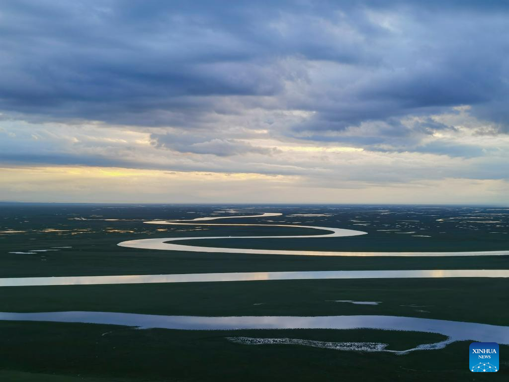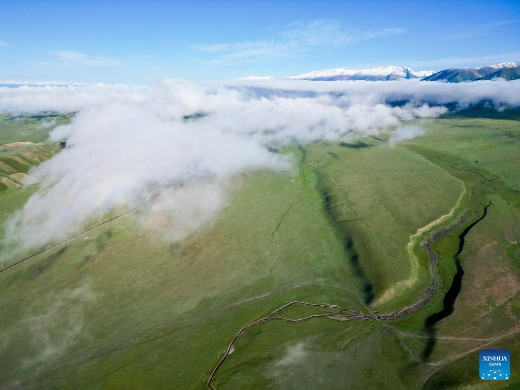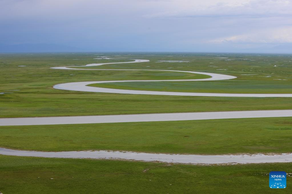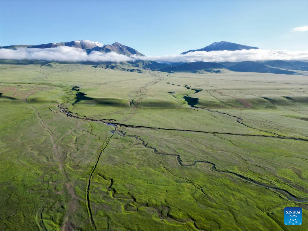 This aerial photo taken on July 7, 2023 shows a view of the Bayan Bulag grassland in Hejing County, Bayingolin Mongolian Autonomous Prefecture, northwest China's Xinjiang Uygur Autonomous Region. Midsummer is one of the best time of year to visit the Bayan Bulag grassland in Hejing County. (Xinhua/Hao Zhao)