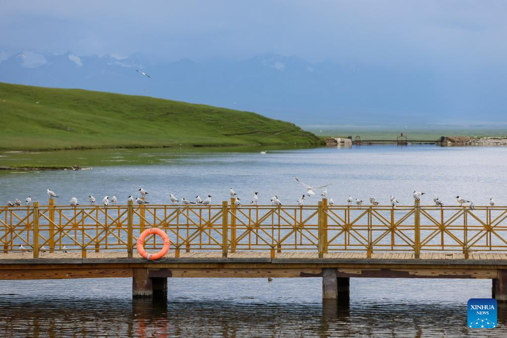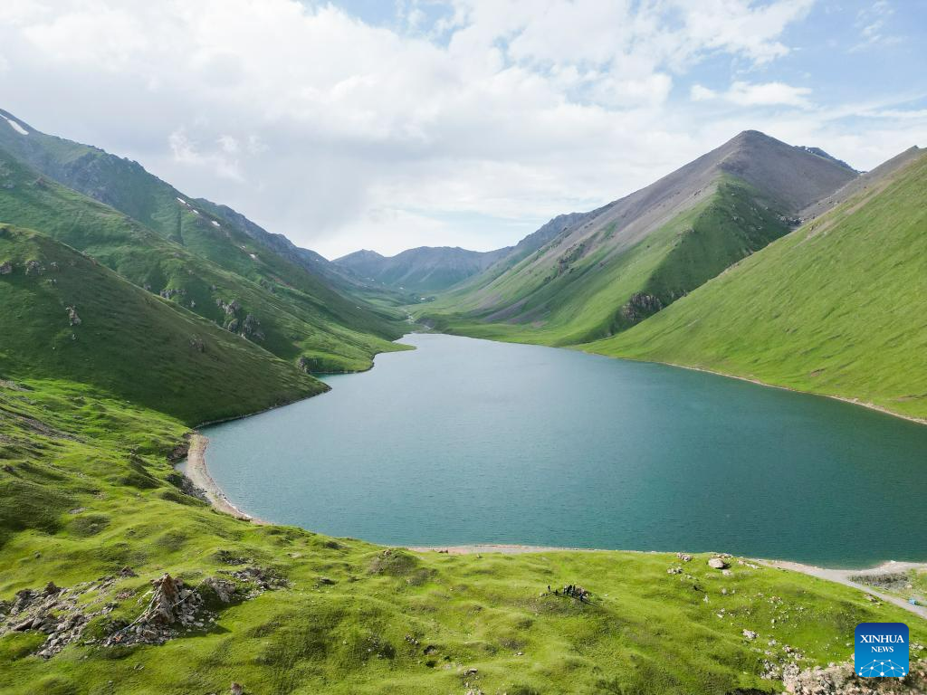 This photo taken on July 6, 2023 shows a mountain lake on the Bayan Bulag grassland in Hejing County, Bayingolin Mongolian Autonomous Prefecture, northwest China's Xinjiang Uygur Autonomous Region. Midsummer is one of the best time of year to visit the Bayan Bulag grassland in Hejing County. (Xinhua/Hao Zhao)