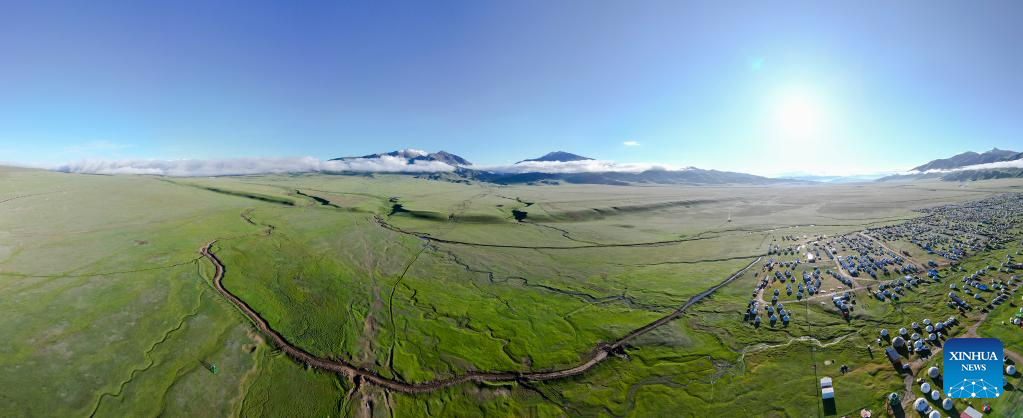 This aerial panorama taken on July 5, 2023 shows a view of the Bayan Bulag grassland in Hejing County, Bayingolin Mongolian Autonomous Prefecture, northwest China's Xinjiang Uygur Autonomous Region. Midsummer is one of the best time of year to visit the Bayan Bulag grassland in Hejing County. (Xinhua/Hao Zhao)