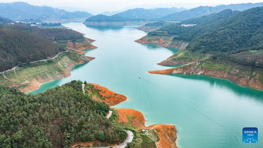 This aerial photo taken on July 4, 2023 shows the scenery of Wanfeng Lake, which is located at the juncture area of southwest China's Yunnan Province, Guizhou Province and south China's Guangxi Zhuang Autonomous Region. Covering an area of 176 square kilometer, the Wanfeng Lake serves as an important ecological barrier to Pearl River Delta region. The local authority has taken proactive measures to tackle pollution and improve the water quality here. (Xinhua/Tao Liang)