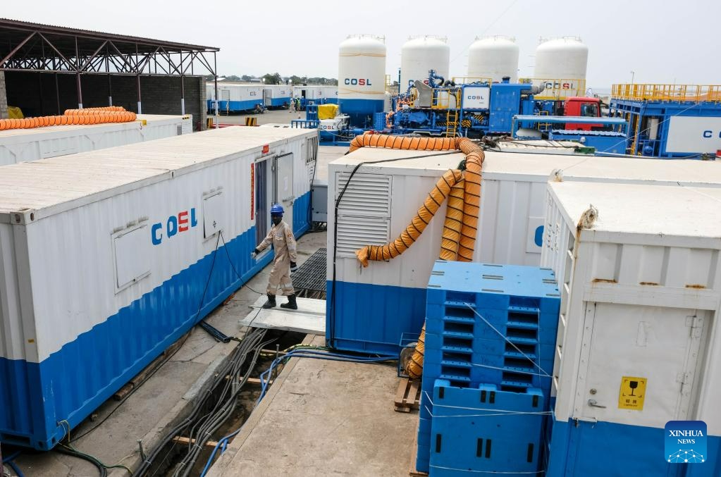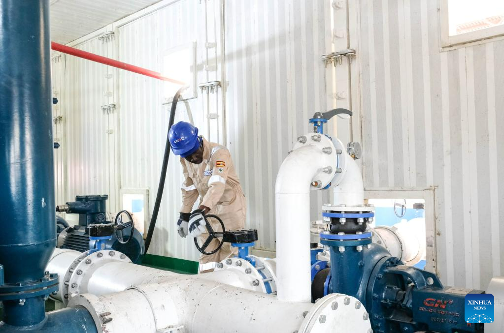A Ugandan worker operates the mud pump unit at the Kingfisher oil field in Kikuube, Uganda, Jan. 24, 2023. (Photo by Hajarah Nalwadda/Xinhua)