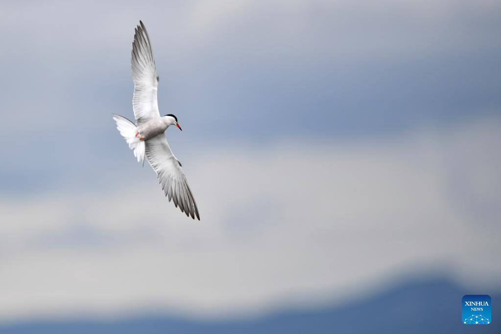 A tern flies over the Gahai Lake wetland in Luqu County of the Tibetan Autonomous Prefecture of Gannan, northwest China's Gansu Province, July 7, 2023. (Xinhua/Zhang Keren)