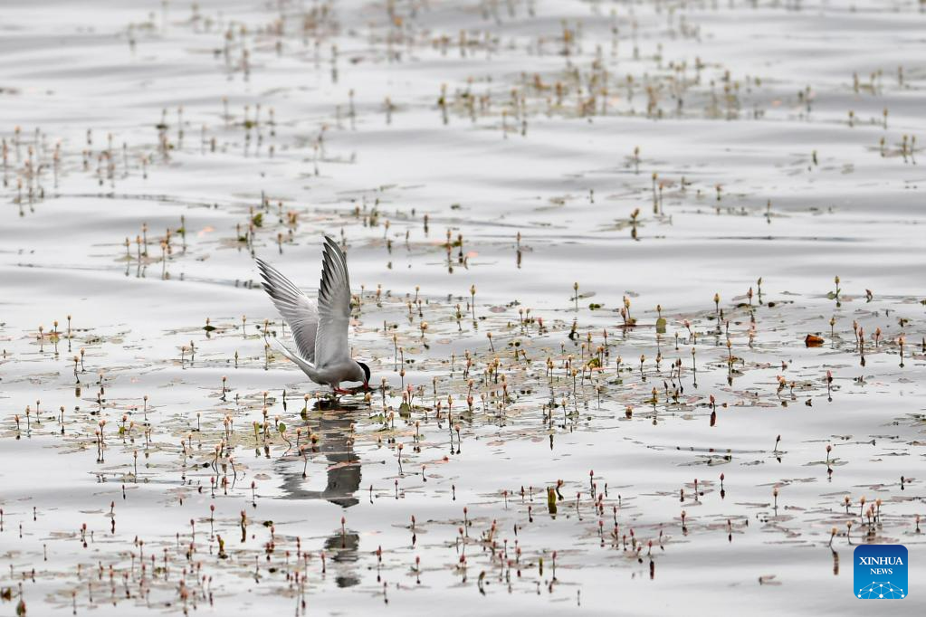 A tern forages on the Gahai Lake wetland in Luqu County of the Tibetan Autonomous Prefecture of Gannan, northwest China's Gansu Province, July 7, 2023. (Xinhua/Zhang Keren)
