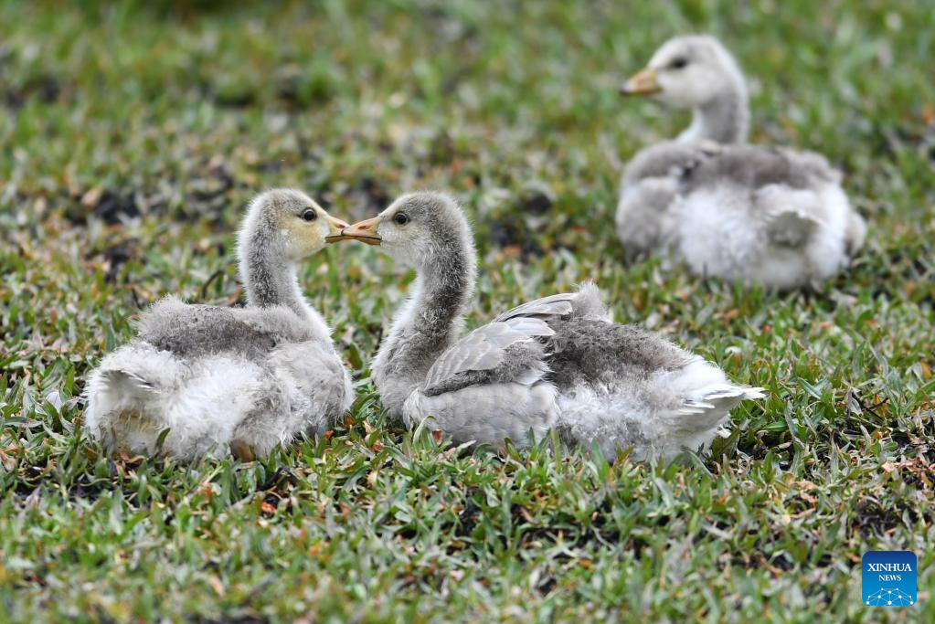 Chicks of bar-headed goose are pictured in the Gahai Lake wetland in Luqu County of the Tibetan Autonomous Prefecture of Gannan, northwest China's Gansu Province, July 7, 2023. (Xinhua/Chen Bin)