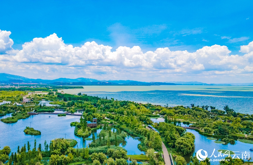 The Dounan wetland park is covered with lush green vegetation in summer. The lake and the blue sky and clouds enhance each other's beauty, while a gentle breeze sweeps across the lake, bringing refreshing air to visitors.