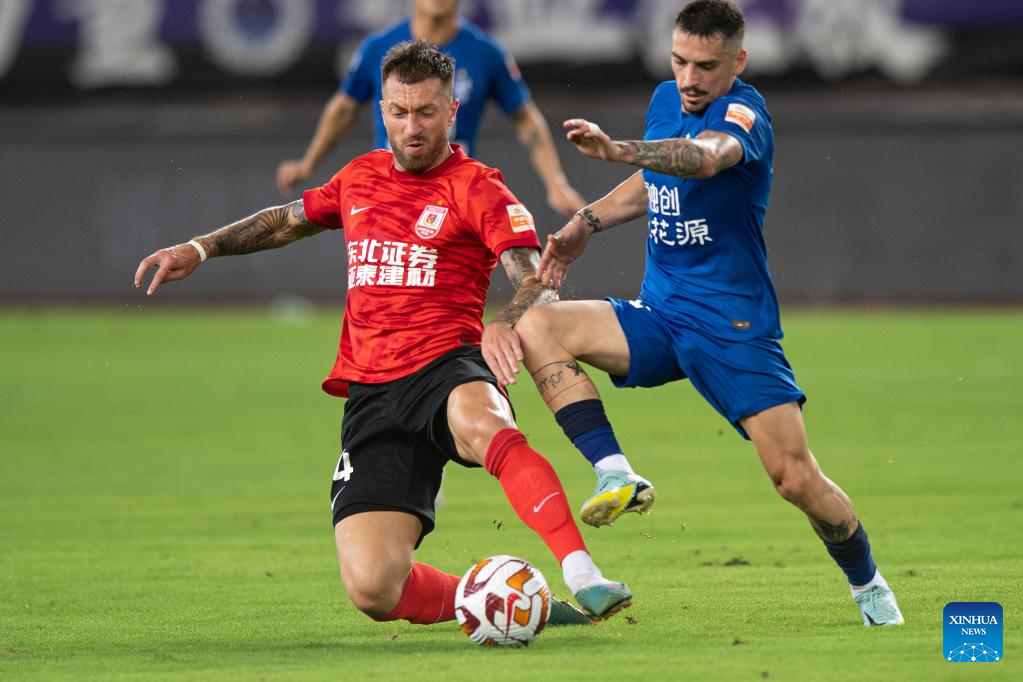 Nicolae Stanciu (R) of Wuhan Three Towns vies with Peter Zulj of Changchun Yatai during a 2023 season Chinese Football Association Super League (CSL) 15th round match between Wuhan Three Towns and Changchun Yatai in Wuhan, central China's Hubei Province, July 8, 2023. (Xinhua/Xiao Yijiu)