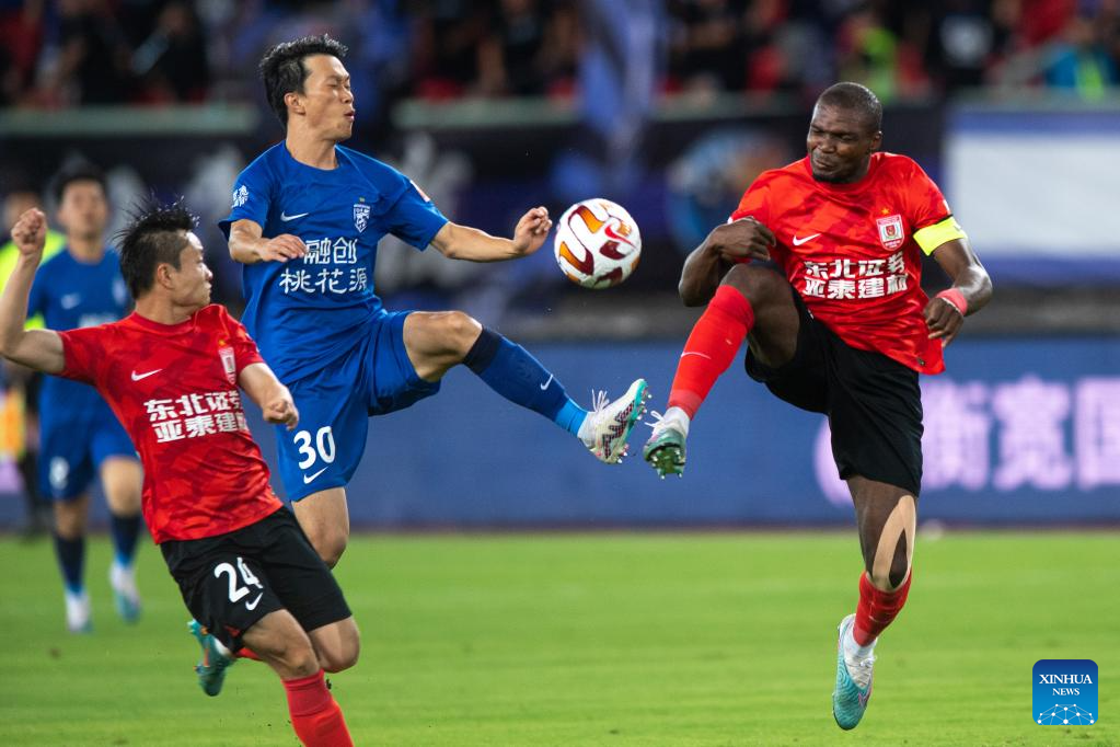 Xie Pengfei (C) of Wuhan Three Towns vies with Jores Okore (R) of Changchun Yatai during a 2023 season Chinese Football Association Super League (CSL) 15th round match between Wuhan Three Towns and Changchun Yatai in Wuhan, central China's Hubei Province, July 8, 2023. (Xinhua/Xiao Yijiu)