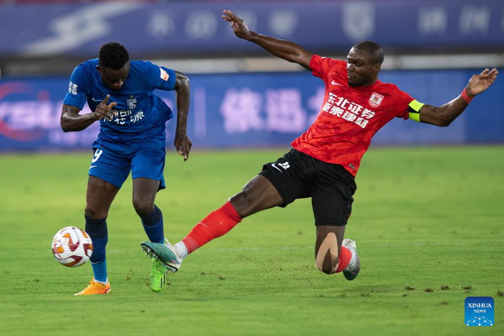 Abdul-Aziz Yakubu (L) of Wuhan Three Towns vies with Jores Okore of Changchun Yatai during a 2023 season Chinese Football Association Super League (CSL) 15th round match between Wuhan Three Towns and Changchun Yatai in Wuhan, central China's Hubei Province, July 8, 2023. (Xinhua/Xiao Yijiu)