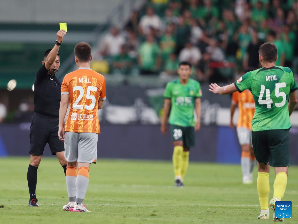 (230708) -- BEIJING, July 8, 2023 (Xinhua) -- Arijan Ademi (R) of Beijing Guoan gets a yellow card during a 2023 season Chinese Football Association Super League (CSL) 15th round match between Beijing Guoan and Shenzhen FC at Workers' Stadium in Beijing, capital of China, July 8, 2023. (Xinhua/Jia Haocheng)