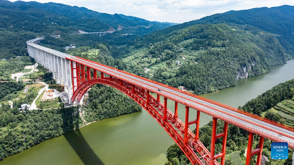 This aerial photo taken on July 10, 2023 shows vehicles moving on a grand bridge of Dejiang-Yuqing expressway in southwest China's Guizhou Province. The Dejiang-Yuqing expressway was completed and opened to traffic on Monday, which has a total length of 104.324 kilometers and connects five counties including Dejiang, Sinan, Fenggang, Shiqian and Yuqing of the cities of Tongren and Zunyi in Guizhou. (Xinhua/Tao Liang)