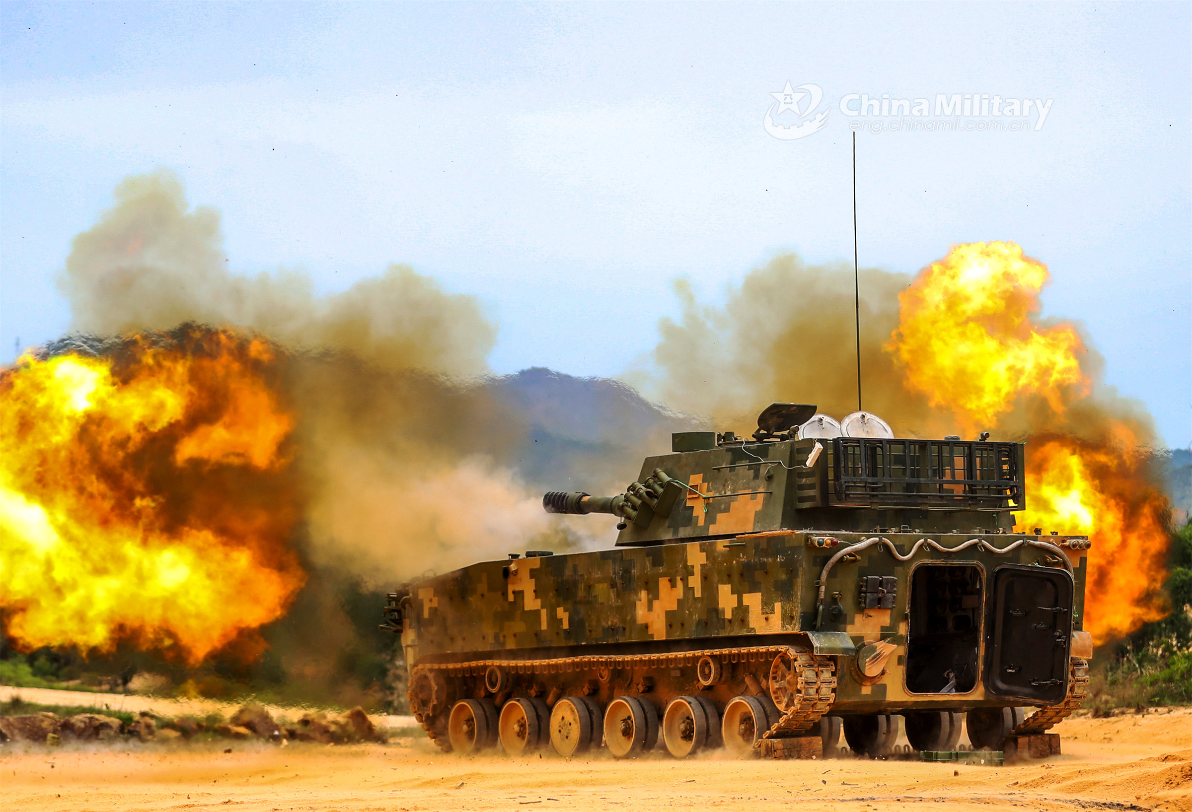Armored vehicles attached to an artillery detachment with a brigade under the PLA 74th Group Army fires down range at mock targets during a live-fire test in the end of June, 2023, aiming to inspect the troops' precision strike capability. (eng.chinamil.com.cn/Photo by Li Bin)