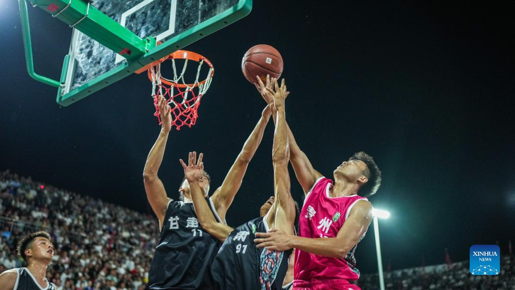 Players of Team Linxia Hui Autonomous Prefecture and Team Qiandongnan Miao and Dong Autonomous Prefecture compete during their match at the China's Village Basketball Competition in Taipan Village, Taijiang County, southwest China's Guizhou Province, June 20, 2023. (Photo/Xinhua)