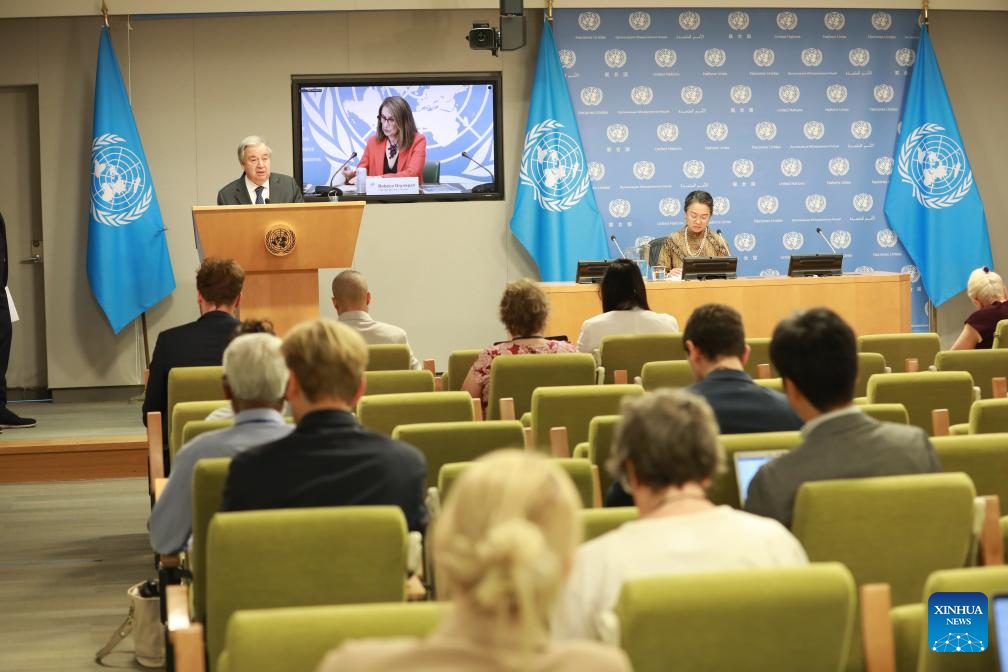 UN Secretary-General Antonio Guterres (at the podium) speaks at the launch of a new report by the UN Global Crisis Response Group entitled "A World of Debt" at the UN headquarters in New York, on July 12, 2023. An unfolding debt crisis underscores the need for urgent action to reform the global financial system, Guterres said on Wednesday. (Xinhua/Xie E)