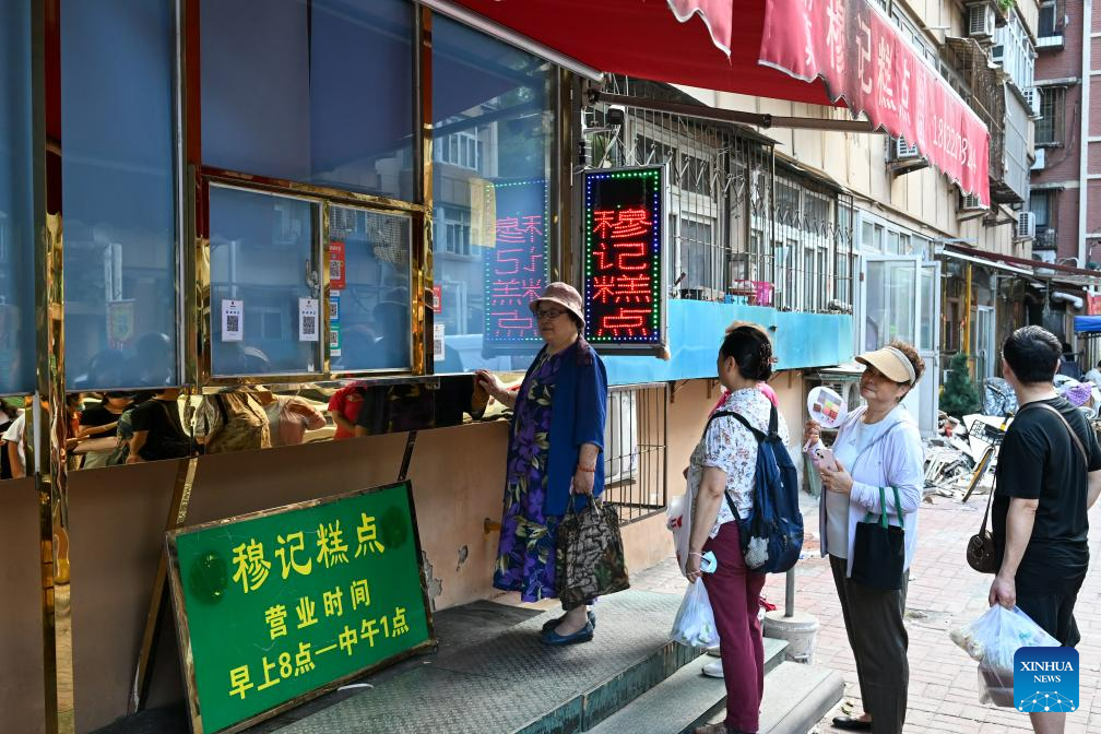 People line up at a breakfast shop in the Northwest Corner of Tianjin, north China, July 11, 2023. The Northwest Corner is named due to its location in the northwest corner of the old city of Tianjin. In the morning, many tourists who speak various dialects drag their suitcases here to have breakfasts with Tianjin characteristics. (Xinhua/Sun Fanyue)