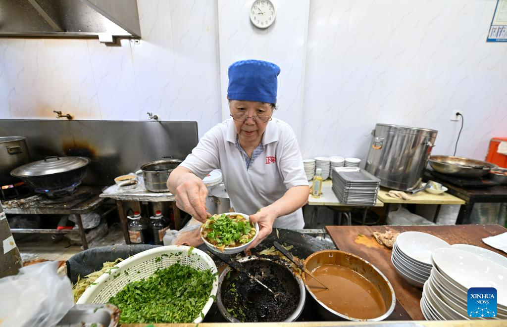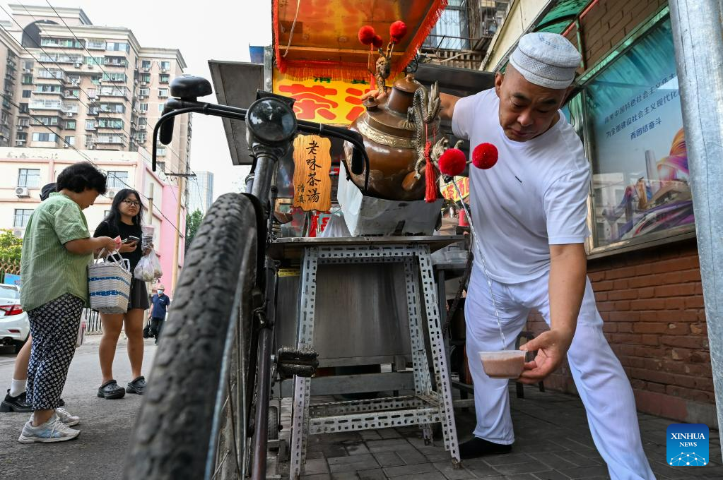 A seller makes tea soup in the Northwest Corner of Tianjin, north China, July 11, 2023. The Northwest Corner is named due to its location in the northwest corner of the old city of Tianjin. In the morning, many tourists who speak various dialects drag their suitcases here to have breakfasts with Tianjin characteristics. (Xinhua/Sun Fanyue)