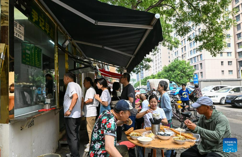 People have breakfast at a breakfast shop in the Northwest Corner of Tianjin, north China, July 10, 2023. The Northwest Corner is named due to its location in the northwest corner of the old city of Tianjin. In the morning, many tourists who speak various dialects drag their suitcases here to have breakfasts with Tianjin characteristics. (Xinhua/Sun Fanyue)