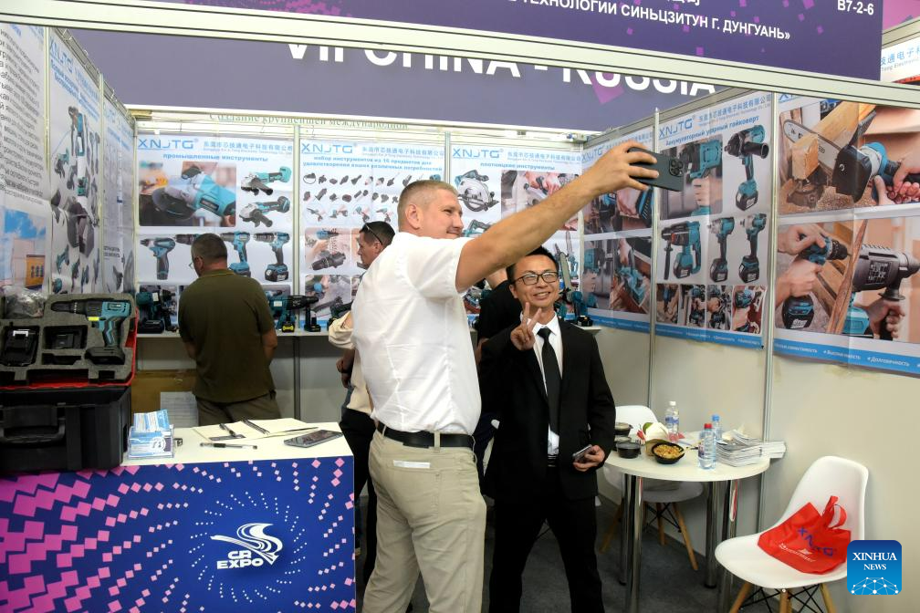 A visitor poses for a photo with a Chinese exhibitor at the 7th China-Russia Expo in Yekaterinburg, Russia, July 11, 2023. The 7th China-Russia Expo will last till July 13. (Xinhua/Huang He)
