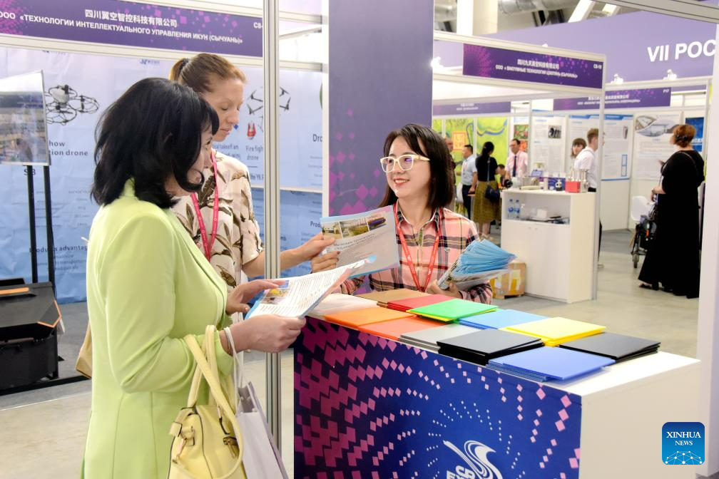 Visitors talk with Chinese exhibitors at the 7th China-Russia Expo in Yekaterinburg, Russia, July 11, 2023. The 7th China-Russia Expo will last till July 13. (Xinhua/Huang He)