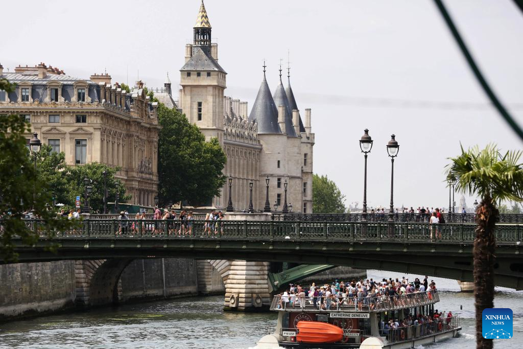 A biker passes by the Seine River in Paris, France, June 28, 2023. (Xinhua/Gao Jing)