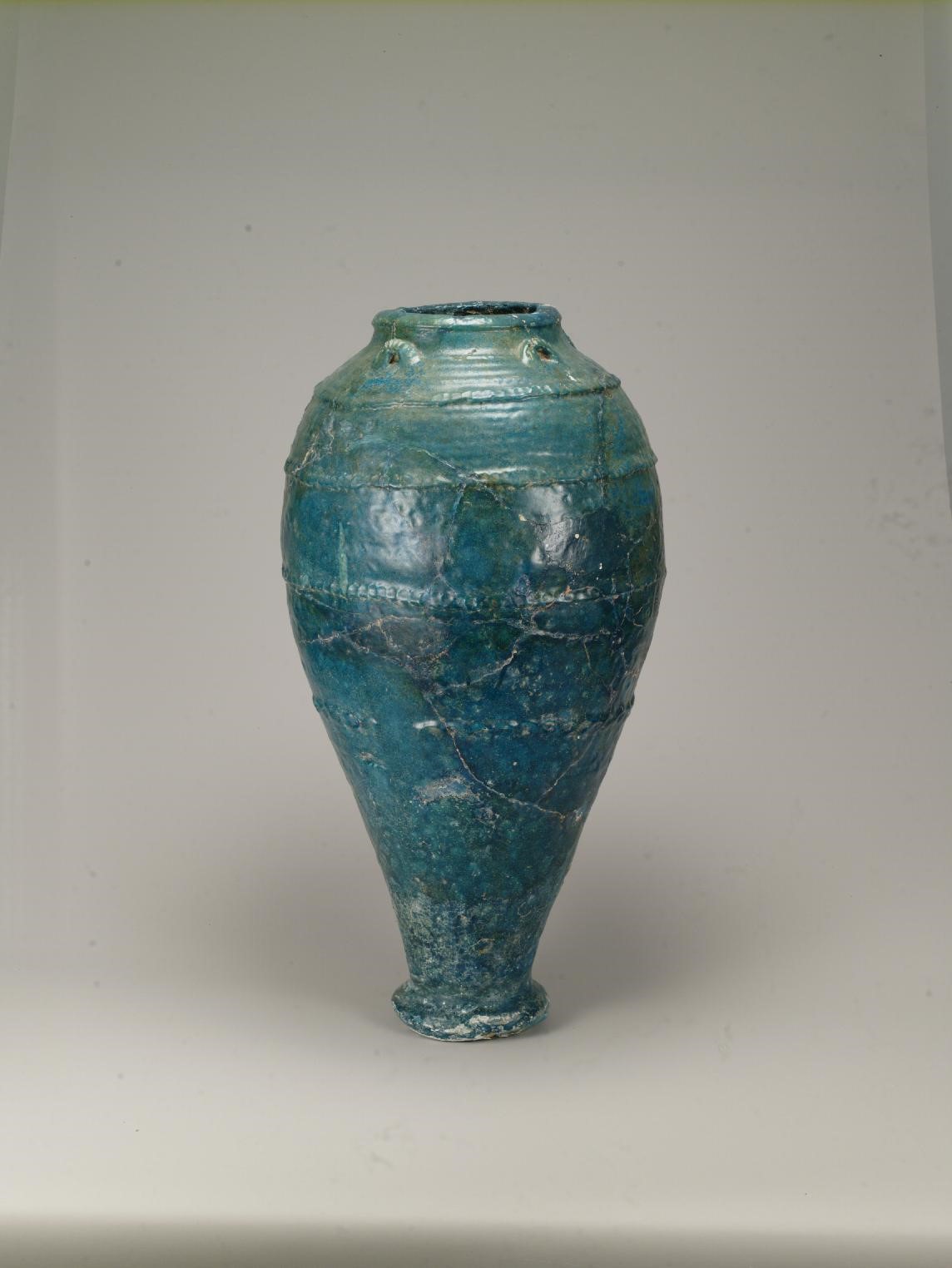 The large pottery bottle is shaped like an olive and evenly covered with blue glaze on its outer surface, conveying a sense of exotic beauty. Experts believe that this pottery ware was likely imported from ancient Persian regions in West Asia.