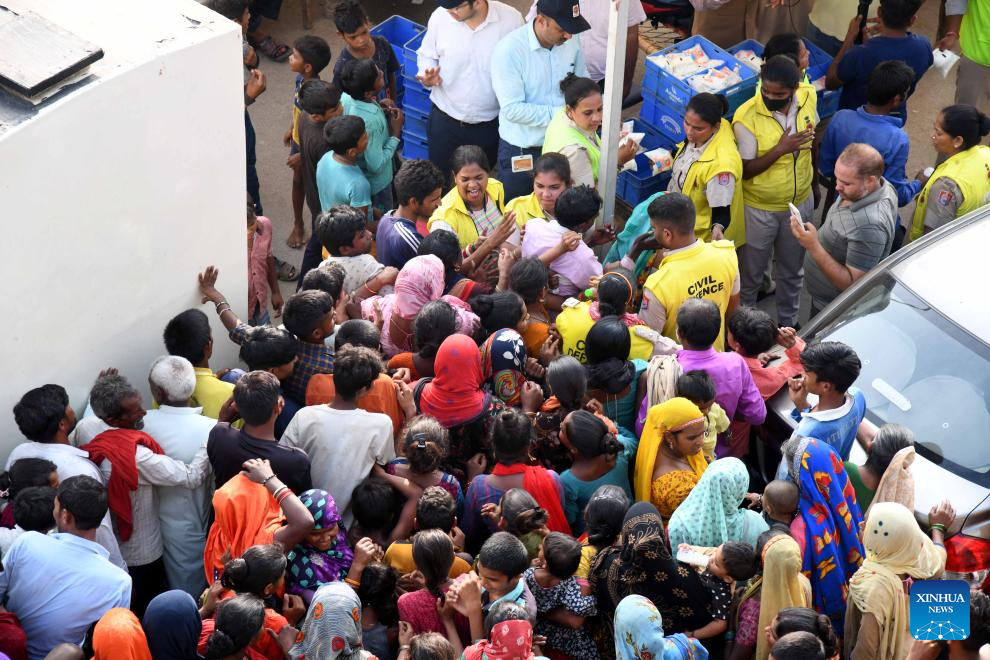 Flood affected people from low-lying area wait to collect milk packets and food in New Delhi, India, July 13, 2023. The water level of river Yamuna, which passes through New Delhi, continues to remain above the danger mark, posing fear of floods, particularly in low-lying areas of the city. (Str/Xinhua)