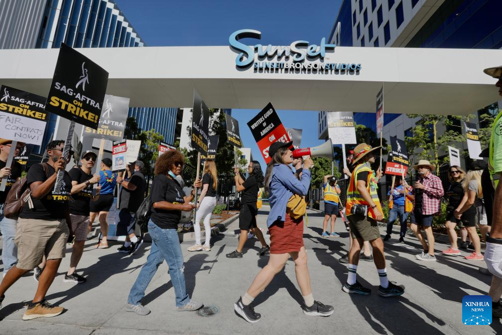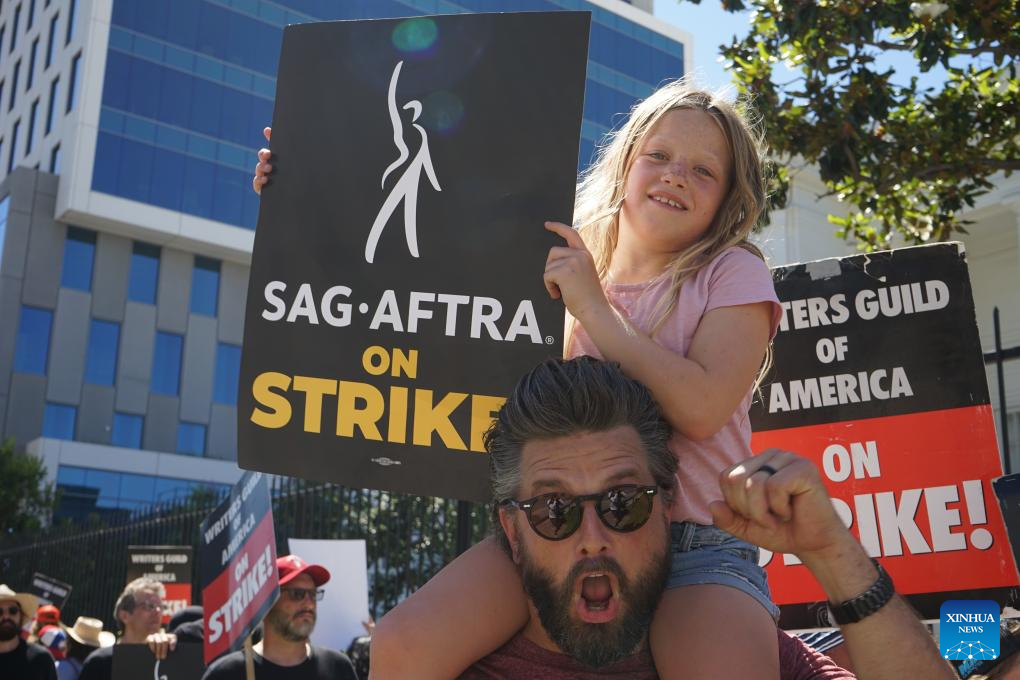 LOS ANGELES, July 14 (Xinhua) -- As Hollywood actors took to the picket lines outside major studios Friday morning, two of Hollywood's most powerful labor unions are striking simultaneously for the first time over 60 years.