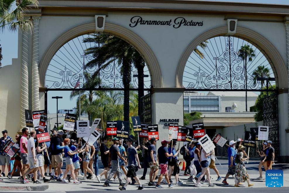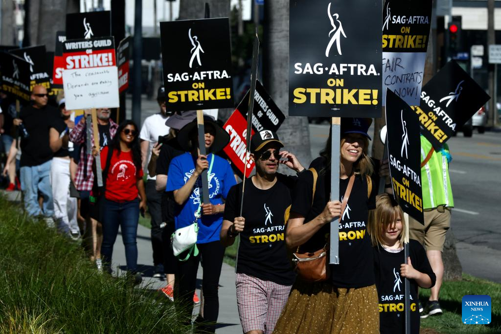 Members of the Screen Actors Guild-American Federation of Television and Radio Artists (SAG-AFTRA) demonstrate in Hollywood, Los Angeles, the United States, on July 14, 2023. As Hollywood actors took to the picket lines outside major studios Friday morning, two of Hollywood's most powerful labor unions are striking simultaneously for the first time over 60 years. (Xinhua)