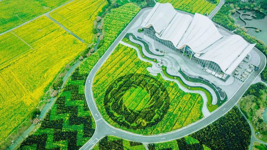 This aerial photo shows the Sun and Immortal Birds Gold Ornament in a flower field in Chengdu of southwest China's Sichuan Province. (Xinhua)