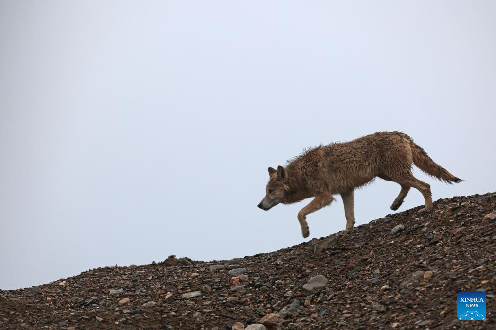This photo taken on July 8, 2023 shows a wolf in the Altun Mountains National Nature Reserve in northwest China's Xinjiang Uygur Autonomous Region. (Xinhua/Wang Peng)